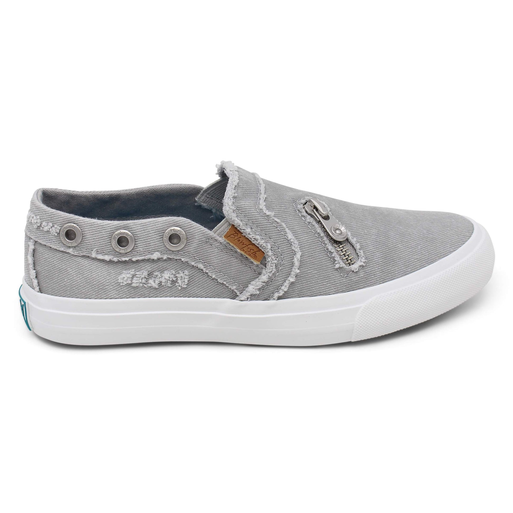 The Mariachi is a slip-on sneaker featuring a distressed canvas upper, as well as Blowfish's signature grommet and zipper details.